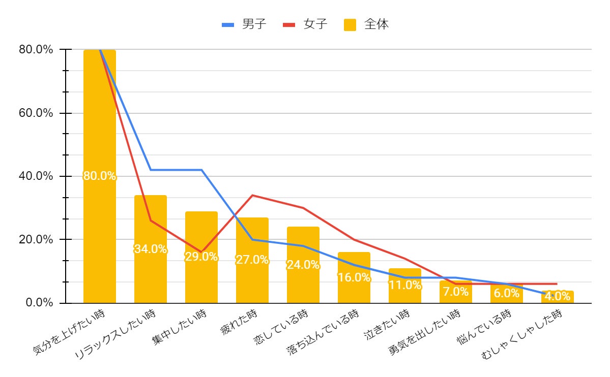 約8割以上が「気分を上げたい時」に音楽を聴いていることが分かりました。また、2位の「リラックスしたい時」