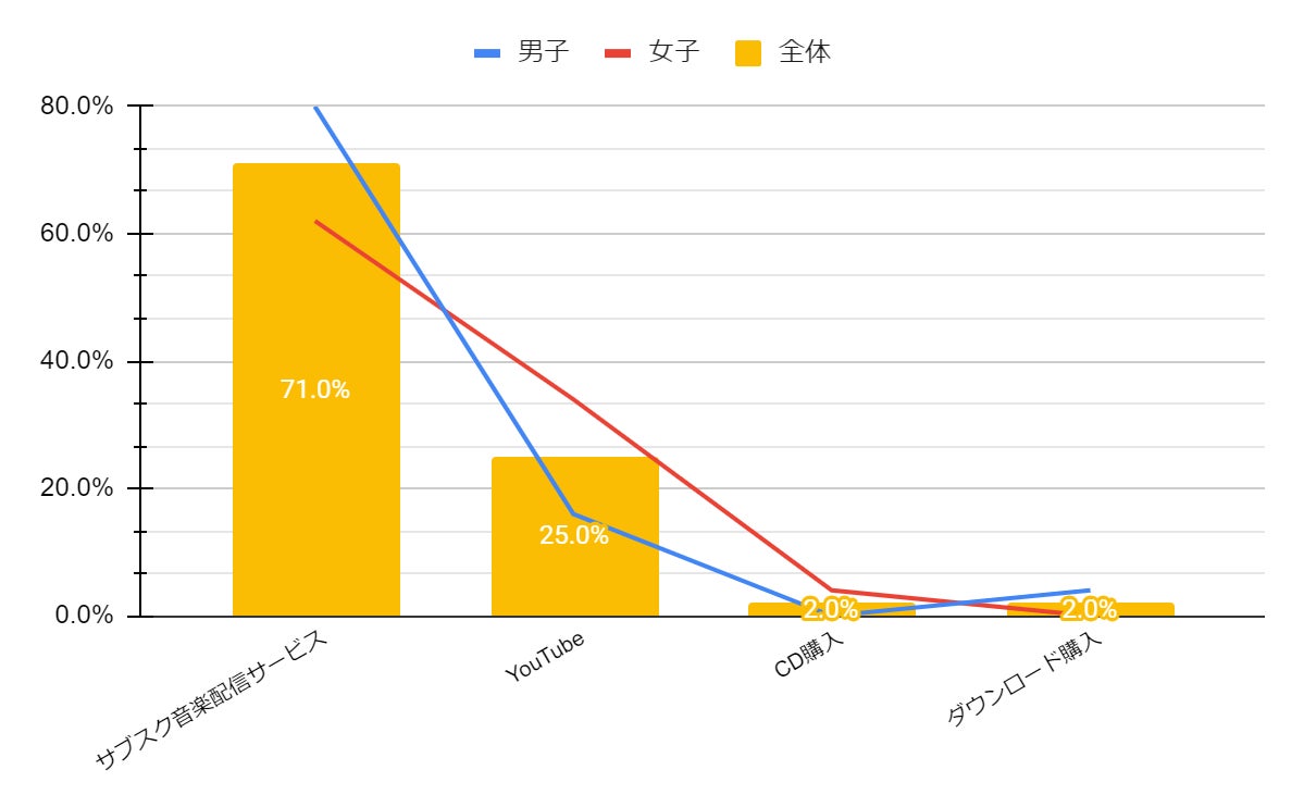 アンケートで、男女共に人気が最も高かったのは、「サブスク音楽配信サービス」でした。各サブスクリプションサービスにおいて、最新曲のランキングが公開されており、トレンドの楽曲を無作為に視聴出来るサービス内容に需要があることが覗えます。