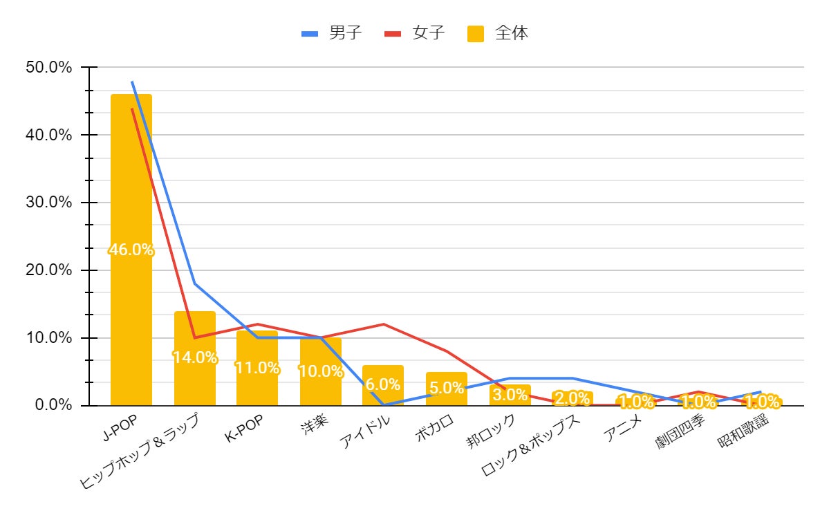 「J-POP」は男女ともに根強い人気があり、また2位の「ヒップホップ&ラップ」については、TikTokで使用されている楽曲に多いことや、トレンドカルチャーの影響を受け、「K-POP」を抑える結果となりました。