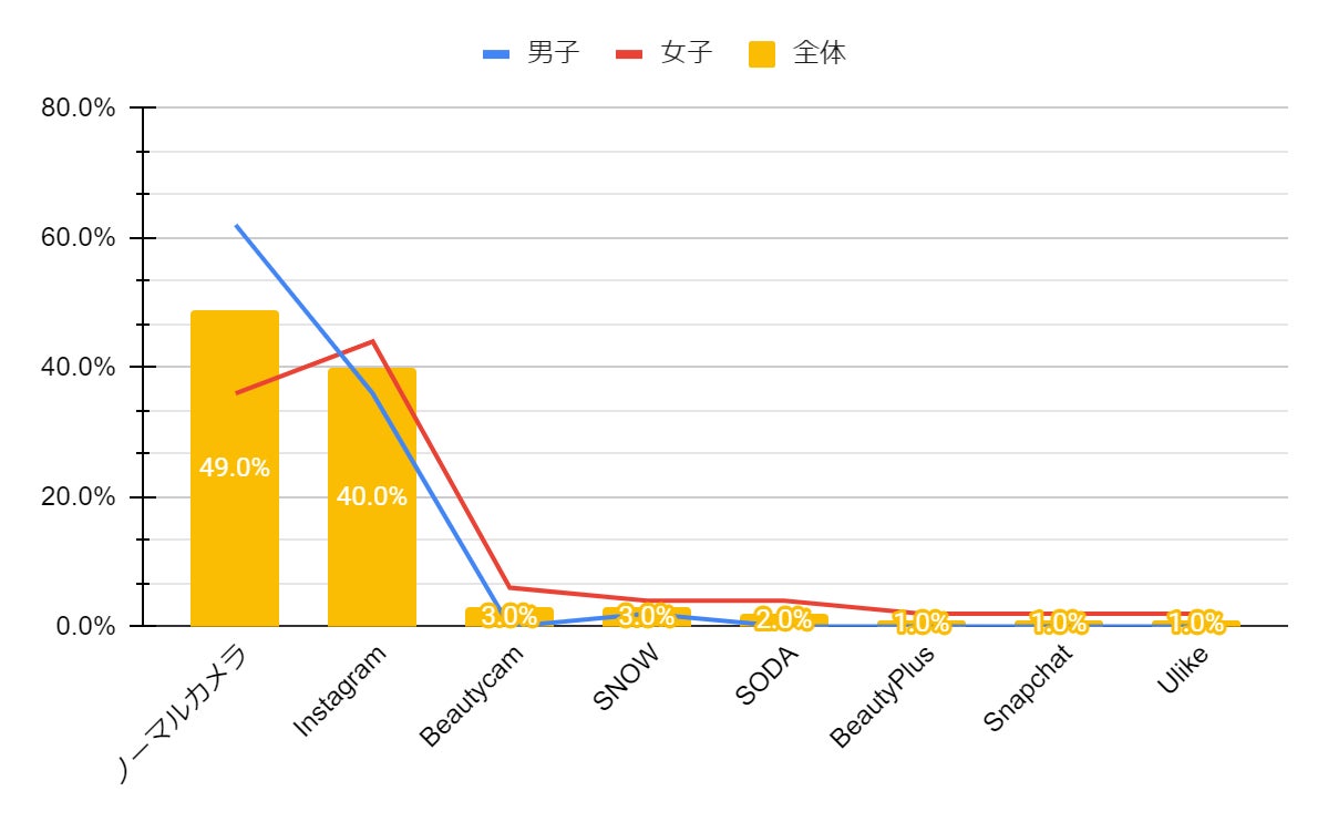 アンケートで、男女共に人気が最も高かったカメラアプリは、「ノーマルカメラ」でした。コメントなどから、“敢えて飾らない”ナチュラルな仕上がりを好む傾向が見られました。「不自然にならずに加工を調整出来て良い」というコメントからも、可愛くみせる=“盛る”をどれだけナチュラルに見せられるかが現在のトレンドなのではないでしょうか。