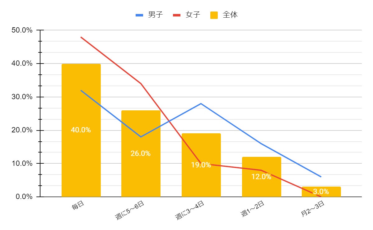 アンケートでは、毎日写真を撮る人が最も多い結果となりました。写真撮影という手段を通して、友人やクラスメイトとのコミュニケーションを図っている様子が覗えます。