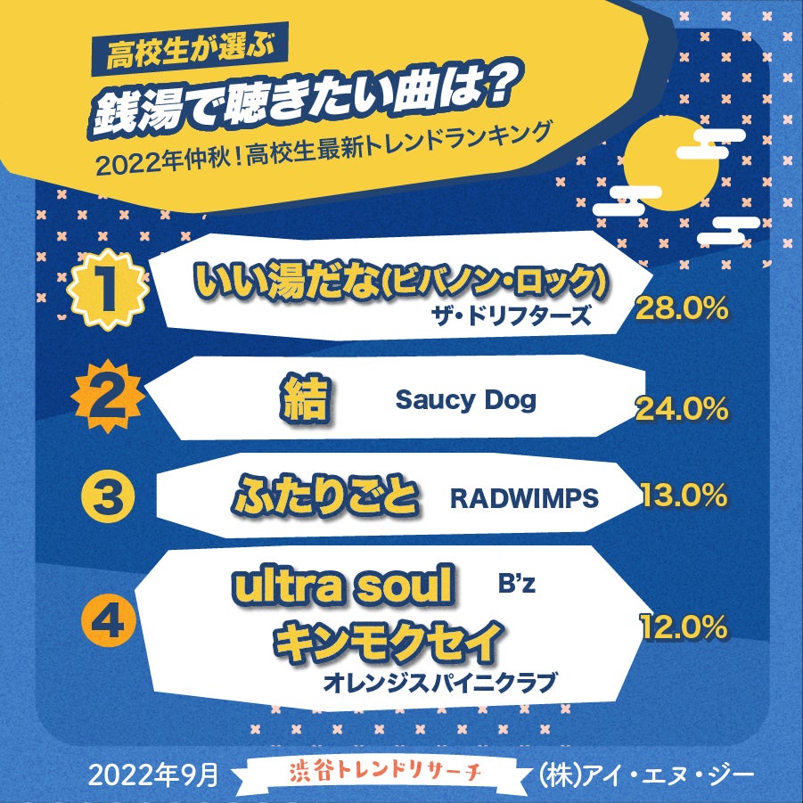1位は、ザ・ドリフターズの「いい湯だな(ビバノン・ロック)」でした。「お風呂と言えばこの曲」(高2・女子)「定番」(高3・男子)といったコメントが寄せられています。