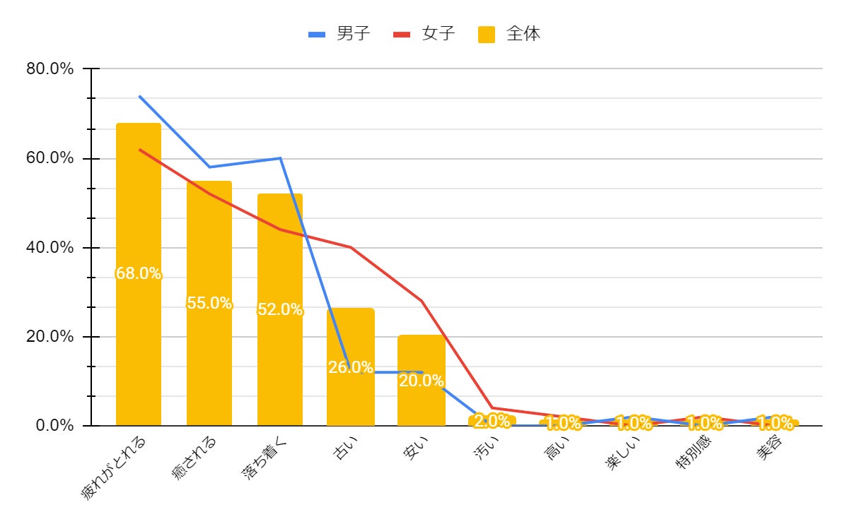 男女共に、1位の「疲れがとれる」を最も多く選択していました。施設内が基本的にスマートフォンの使用を禁止していることから、ちょっとした”デジタルデトックス”が出来るという点も「疲れがとれる」や「癒される」がイメージとして上位に挙がった要因の一つではないでしょうか。