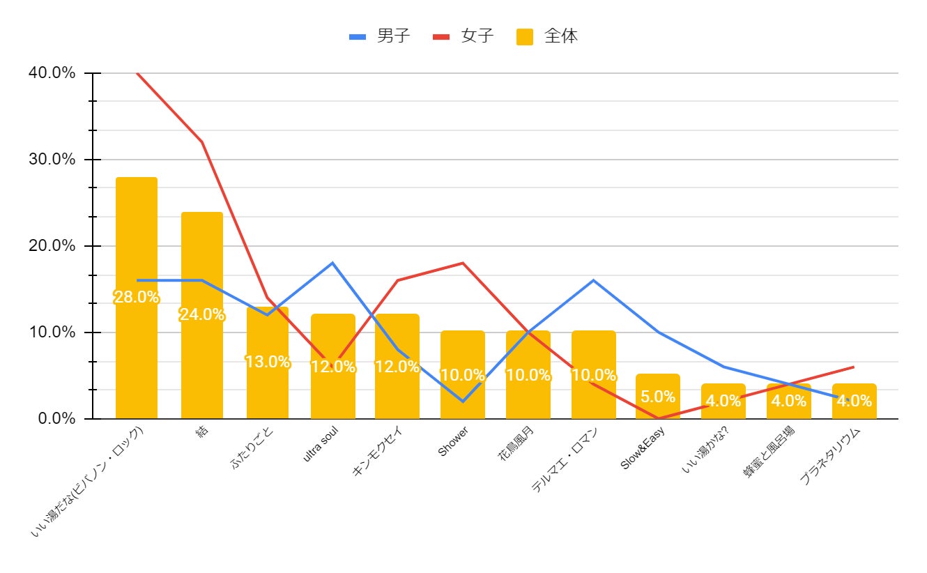 男女共に人気が最も高かったのは、1位のザ・ドリフターズの「いい湯だな(ビバノン・ロック)」でした。落ち着いた空間作りを求める意見が多くあった一方で、「居合わせた人と折角なら一緒に楽しみたい」といった理由から、B’zの「ultra soul」のような盛り上がる曲を選ぶ人もいました。