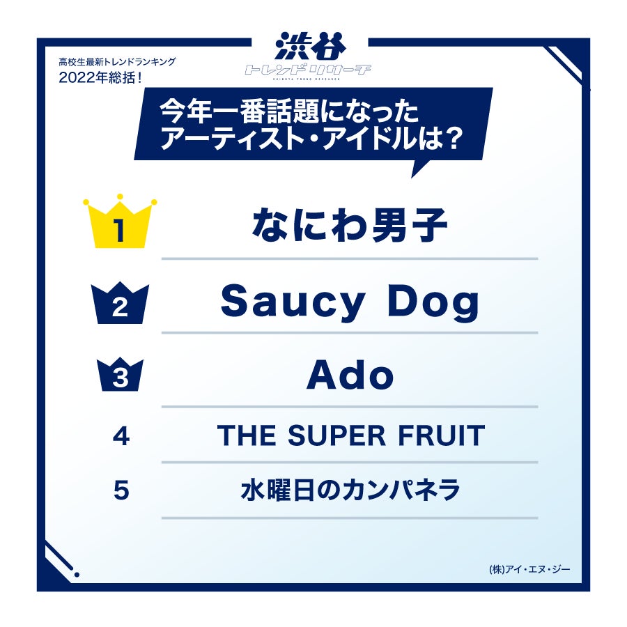 「なにわ男子」が1位を獲得。メジャーデビュー後、初のツアーとなる『なにわ男子 Debut Tour 2022 1st Love』を完走したほか、冠ラジオ『なにわ男子の初心ラジ!』の放送開始や紅白歌合戦へ初の出場など、多岐に渡る活動に注目を集めました。2位には、日本の3ピースポップバンド「Saucy Dog」がランクイン。全国高校サッカー選手権大会の応援歌アーティストを務め上げたほか、紅白歌合戦へ初出場することが発表されました。3位は、歌い手の「Ado」。歌唱パートを担当した映画『ONE PIECE FILM RED』のヒロインであるウタは、”史上初”のアニメキャラクターで紅白歌合戦に紅白歌手として出場することになり話題となっています。