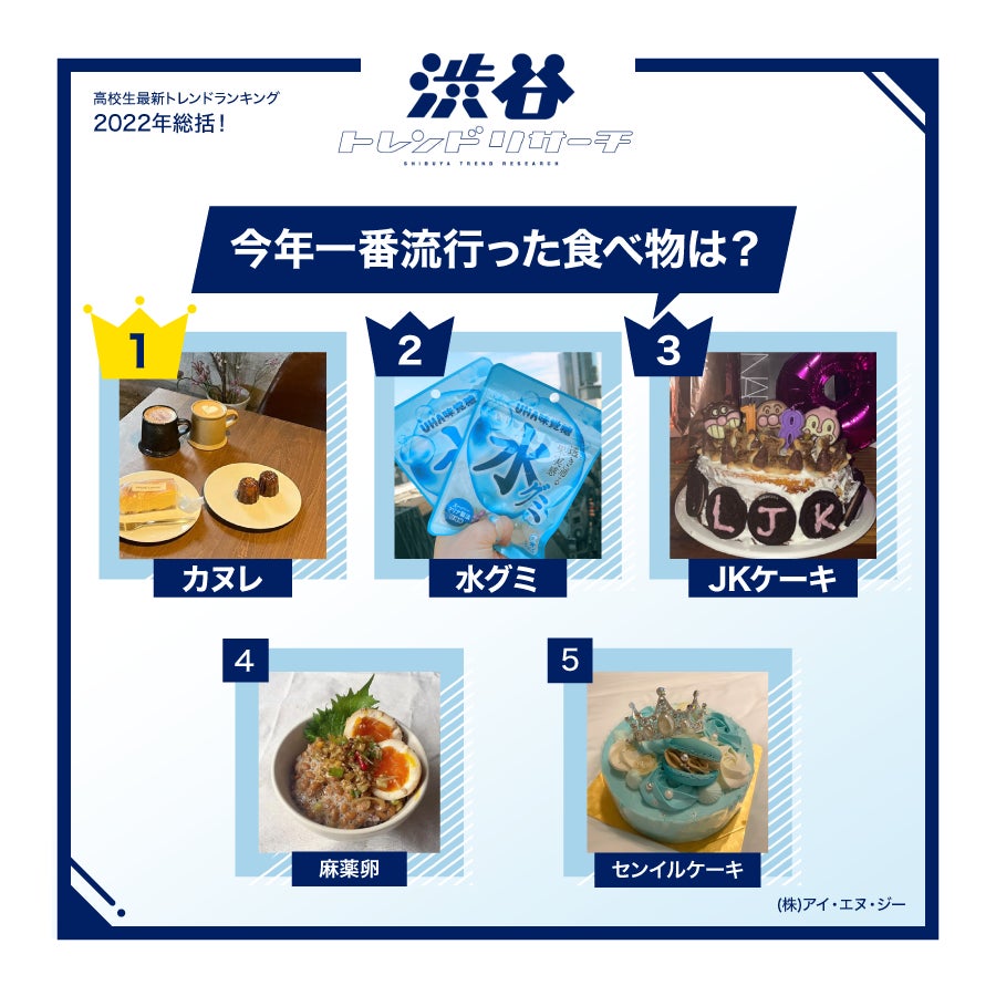 「カヌレ」が1位を獲得。7人組ボーイズグループBE:FIRSTがCM出演をする”カヌレット”やジャニーズグループなにわ男子×ウチカフェ(ローソン)のコラボスイーツ”濃密カヌレ”など、専門店以外でも購入出来るようになったことが人気に拍車をかけたようです。2位には「水グミ」が登場。これまでの”地球グミ”や”ロープグミ”とは対照的な透明感溢れるビジュアルに注目が集まりました。空前ともいえるグミブームが続いています。3位は「JKケーキ」。お菓子やキャンドルでデコレーションしたケーキのことで、FJK(First Joshi Kosei)やLJK(Last Joshi Kosei)など、自分の学年をチョコペンで描くのがポイントです。昨年度流行した”ナチョステーブル”同様に、作る工程もSNS映えを狙えるという点から人気を集めました。