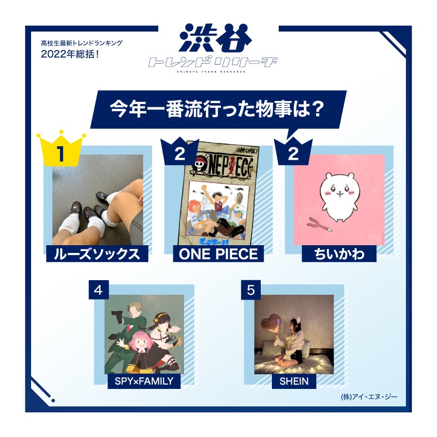 Y2K(2000年代)ファッションブームより「ルーズソックス」が1位を獲得。制服だけでなく、私服にあわせて普段使い出来ることからも人気を集めました。2位は今年連載25周年を迎えた「ONE PIECE」。8月に公開された映画『ONE PIECE FILM RED』はシリーズとしては最大規模の90以上の国と地域での公開となりました。同率2位には、”ちいかわ”こと「ちいかわ なんか小さくてかわいいやつ」が登場。6月には日本キャラクター大賞のグランプリを受賞しました。コラボ商品は即日完売することが多く、”ちいかわ戦争”と呼ばれることもあるようです。